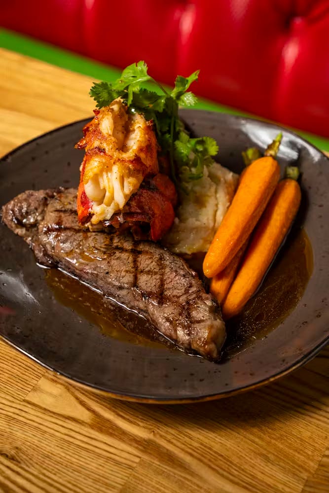 10oz black angus steak, chicken taquito, aguacate salsa, esquite, black beans, flour or corn tortillas
